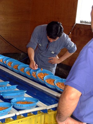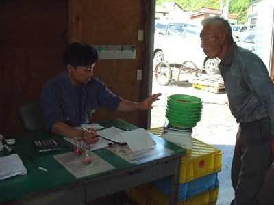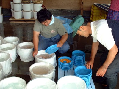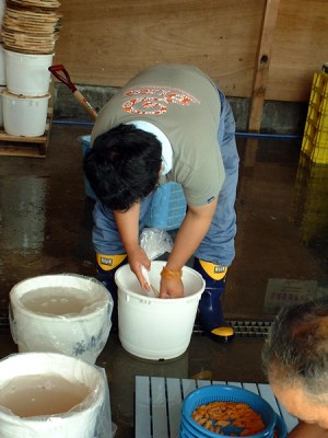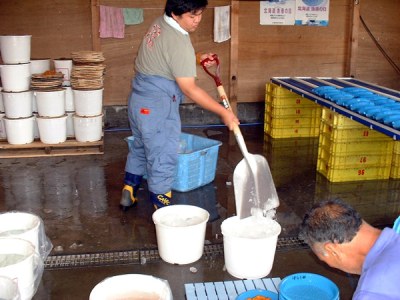 収容1:出荷用の樽へ3.5キログラムくらいづつ収容します。