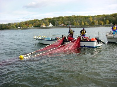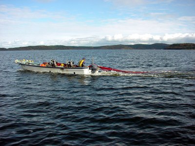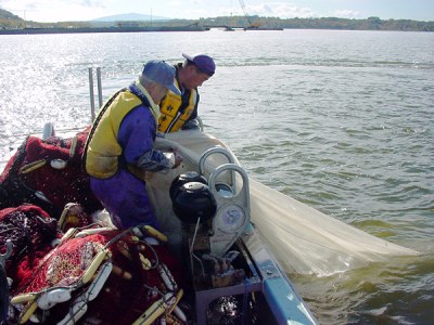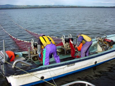 操業は二人一組で2隻の船を使います。1隻を岸辺にアンカーで固定し、もう1隻で手網を付けた袋状の網を沖合に向け半円形状に400メートル~450メートル張り出し、これを油圧式の自動巻揚機で船に引き寄せ、網を引き揚げます。
