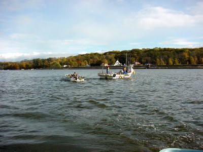 投網1:1隻を固定し、もう1隻で網を投網します。