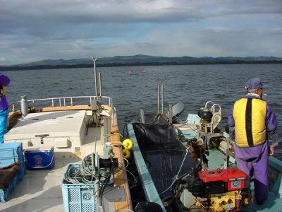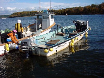 仲買が船外機船で、各漁業者を回り漁獲物の受け取りをします。