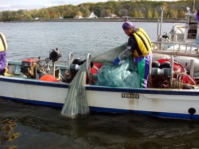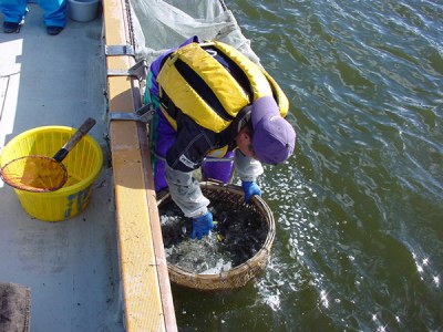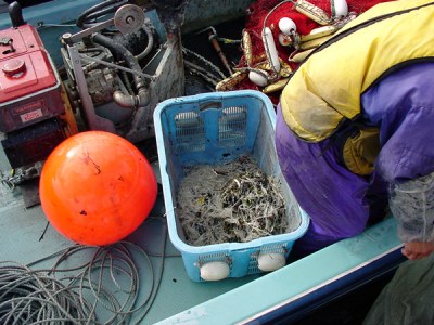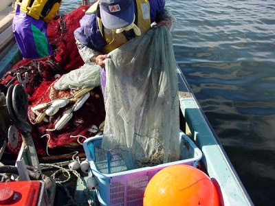 揚網4:袋網を開けて中の漁獲物を籠に収容します。