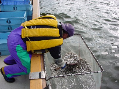 選別1:ワカサギとシラウオを枠網の中で選別します。