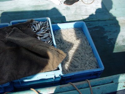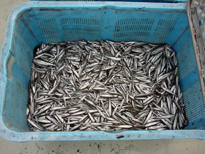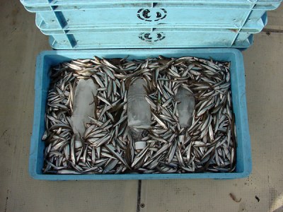 漁獲物:籠に収容された漁獲物。ワカサギとシラウオが混じってます。