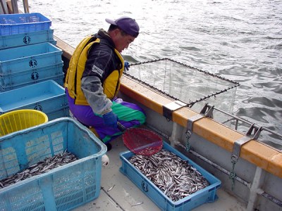 | 漁具 | 袋網の目合い2ミリメートル~4ミリメートル(もじ網) ひき網の長さ約150メートル 網から船までのロープの長さ400メートル~450メートル  |