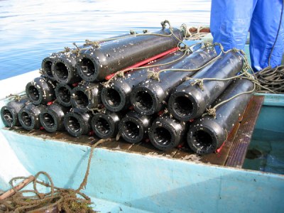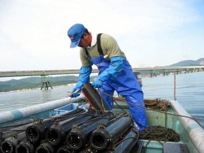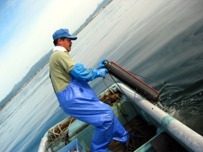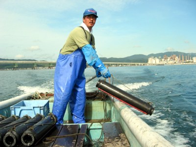 どう投入:漁場に到着後、船を走らせながらどうを設置していきます。