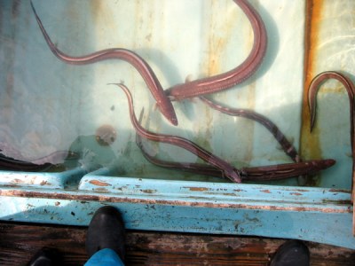 漁獲物:漁獲されたマアナゴは船の活魚槽に入れられます。