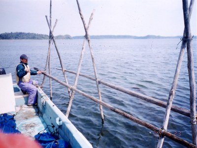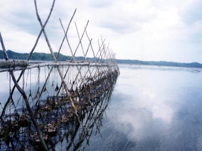 | 漁具 | ・養殖施設は一般的なはえ縄式と杭などを湖底に押し立てて組んだ通称やぐら式である。施設1台当たりの長さははえ縄式が100メートル、やぐら式が50メートルである。 ・施設の材料は、はえ縄が太さ18ミリメートル以上のロープで、やぐら式は鉄管やヤチダモの木である。やぐらの組み立てには鉄管が専用金具を、ヤチダモの木は縄を使用する。 ・はえ縄の固定には杭やアンカー、コンクリートブロックを用い、アンカーは施設1台当たり37.5キログラム以上のものを2丁使用する。フロートは主に直径30~36センチメートルのものを使用する。 ・原盤の垂下連はロープへの挟み込み式と針金式の2種類があり、針金式には鋼線の針金と原盤の重なりを防ぐために12~14センチメートルのビニールチューブを使用する。垂下連の長さは1~1.5メートル。 ・養殖かごは直径50~60センチメートルの丸かごで、湖内では1~5段かご、湾内では5~10段かごを使用する。主な目合いは3・5・7分(0.9・1.5・2.1センチメートル)目合いで、シングルシードカキのみ直径40センチメートルの1分(3ミリメートル)目合い丸かごも使用する。かごの耐用年数は5~10年。  |