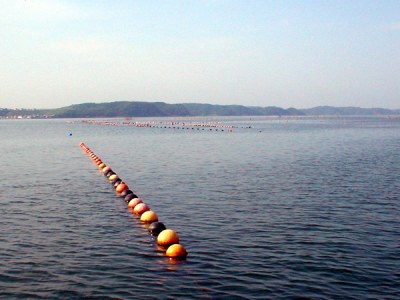 はえ縄式養殖施設:はえ縄式の養殖施設。この下にカキが垂下されています。