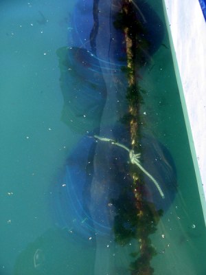 養殖かご:はえ縄式養殖施設に垂下する養殖かご。