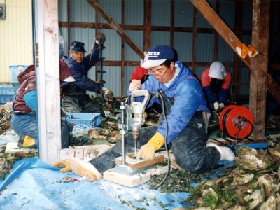 穴あけ:搬入した原盤(種苗の付着しているホタテ貝殻)を連にして垂下するために、まずはホタテ貝殻に穴を開けます。