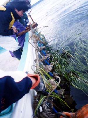 原盤垂下:はえ縄式養殖施設に原盤垂下連を固定します。