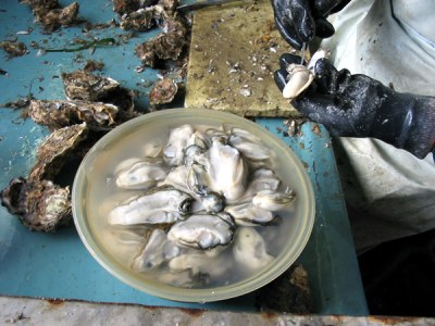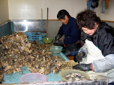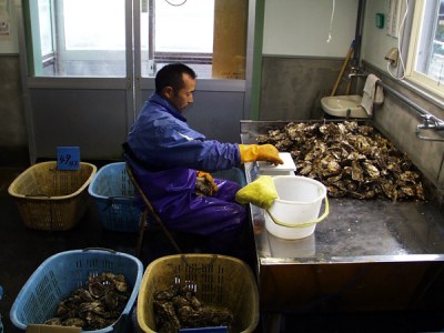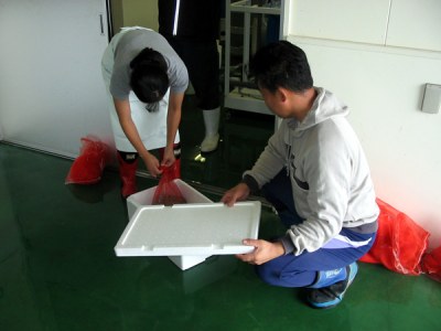 剥き作業:殻を外したカキはきれいに滅菌海水で洗浄してパックに詰めます。