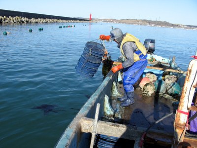 かご収容:目合の大きなかごに収容して再び施設へ垂下します。