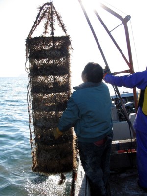 厚岸町では、平成11年に国内初となるシングルシード方式の種苗センターを整備し、毎年4月頃に殻高3~5ミリメートル種苗数百万個を数十漁家に配布しています。 配布後の種苗は、出荷まですべてかごで養成され、最初は1分目合いのかごに収容し、成長に合わせて目合いの大きいかごに入れ換えます。その後は原盤養殖と同様の工程を経て出荷となります。出荷サイズのカキは、普通のものに比べ小ぶりですが殻に深みがあるのが特徴です。現在の主な出荷時期は11~12月となっています。