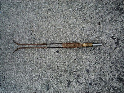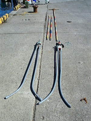 マッカ1:先が二股に分かれ、コンブを絡めてねじり採る漁具で、握り、ホコ、マッカの3部で構成されています。水深に合わせてホコの部分を継ぎ足して操業します。写真は鉄製のマッカです。二股の部分の幅が狭い鉄製のマッカは、良質なコンブを選んで採る場合に使用しています。