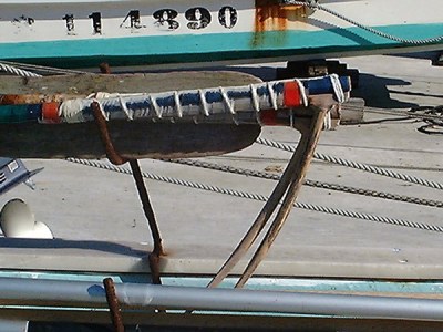カギ:カマで切断したコンブやマッカから外れたコンブを回収する漁具です。木製です。
