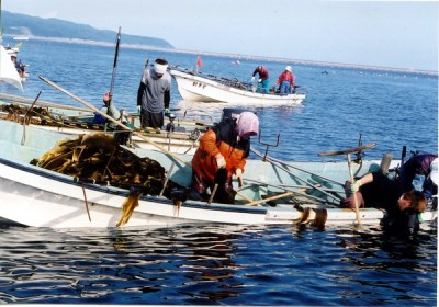 こんぶ漁業は古くから行われており、その漁法はコンブを漁具に絡めてねじり採る方法と根からコンブを切り取って採る方法があります。漁場は主に水深の浅い岩礁地帯や玉石地帯などの沿岸域に形成されています。