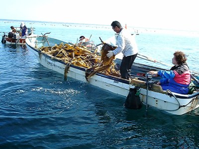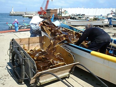 陸揚げ:コンブを漁船からリアカーに積み込んでいます。