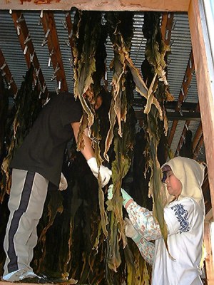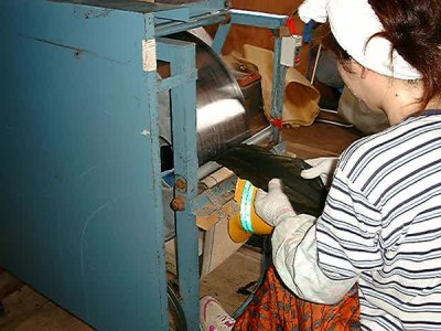 製品化:乾いたコンブは、製品規格に合わせて加工し製品化します。これはコンブを伸しているところです。