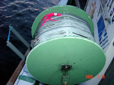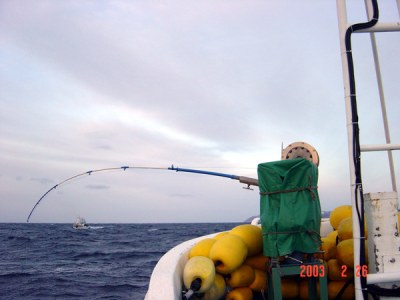 自動釣り機:船首、船尾にこの自動釣り機を装備し、漁獲効率の向上を図っている船もあります。仕掛けの棚降ろしから巻き上げまで全自動で行います。