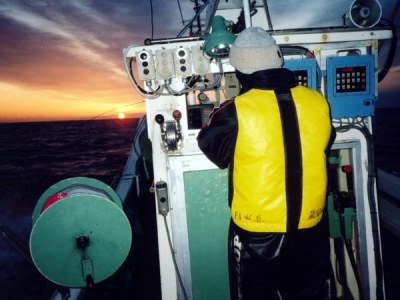 出港:海峡に昇る朝日を目指して漁場へ向かいます。