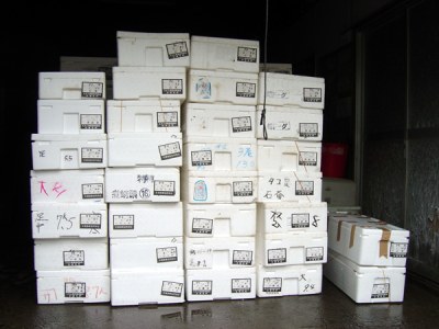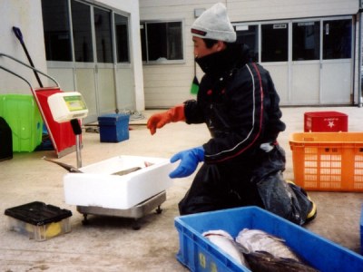 出荷:発泡スチロール箱に収容されたマダラは漁協の集荷所に持ち込まれ出荷されます。一本釣りなので、小小小サイズはみられず、大大サイズでは15キログラムを超える大物もみられます。