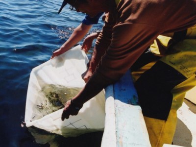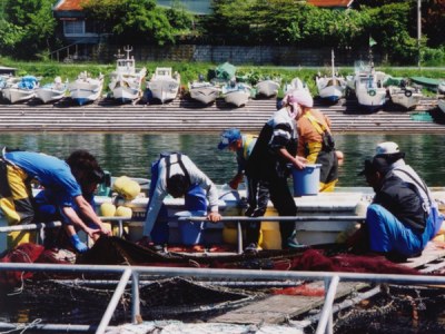 中間育成:青年部による海中中間育成(於:函館市(旧恵山町)山背泊漁港内)。