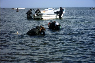 漁場:主な漁場は海岸から100メートル~200メートルまでの岩盤域で、漁場まで歩いていく人もいれば船外機船を使用する人もいます。