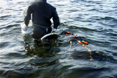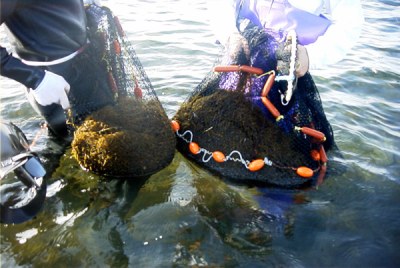 収容1:採取したイシモズクは腰につけた網袋に収容します。