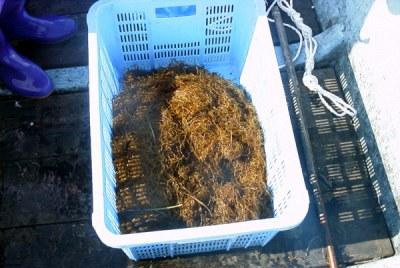 採取2:覗きメガネを使用して採取します。イシモズクは他の海藻に付着しているので、雑物がどうしても混じります。