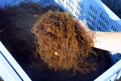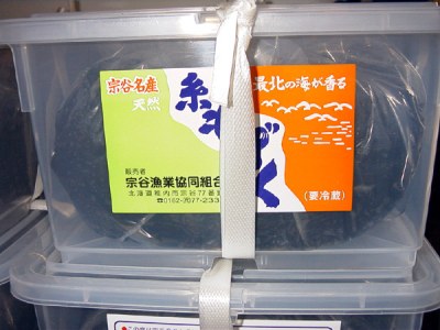 採取したイシモズクは、陸上にて他の海藻や雑物などの混入物を除去して塩蔵し、専用のパックに詰めて出荷します。