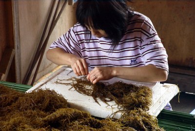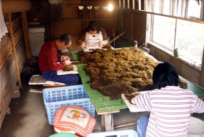 選別(1):作業場での選別。他の海藻や雑物からモズクを選り分けています。
