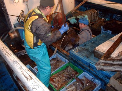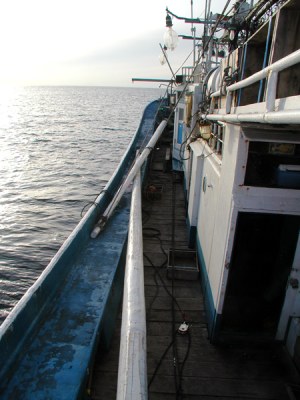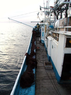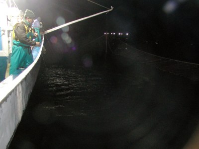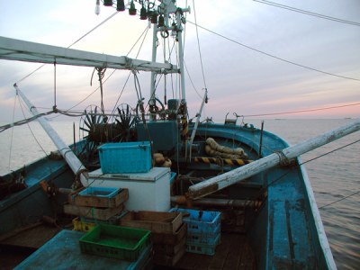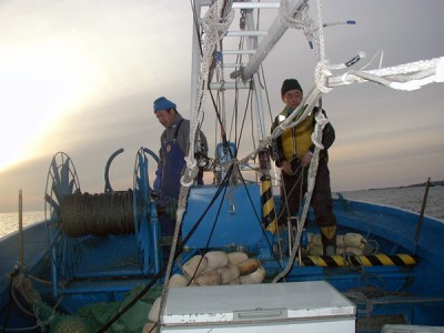 投網1:漁場には出港後20分位で到着します。船尾側のアンカーで船を固定します。