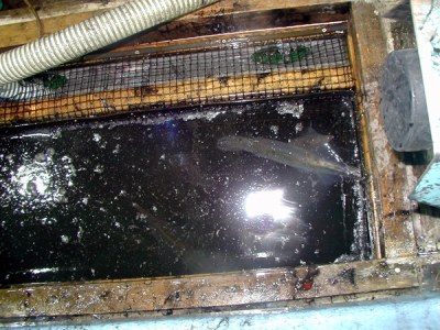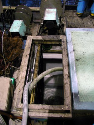陸揚げ1:今回は水槽に収容しきれないほど大漁でした。帰港して陸揚げの準備です。