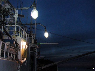 集魚灯点灯:集魚灯をつけます。辺りは暗くなってきました。