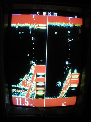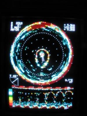 ソナーの画面:船の下にヤリイカが回遊してくるのを、スキャニングソナーを見ながら待ちます。