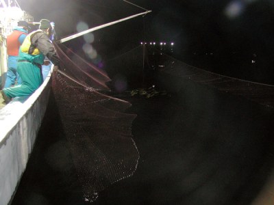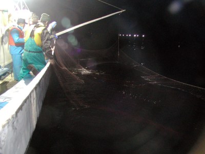 揚網5:網が巻き揚がりました。ここからは手で網を手繰り寄せていきます。