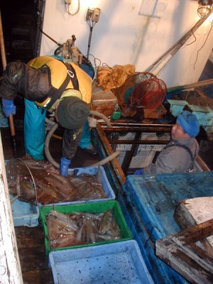 揚網9:直接手で触らないようにヤリイカを集めていきます。