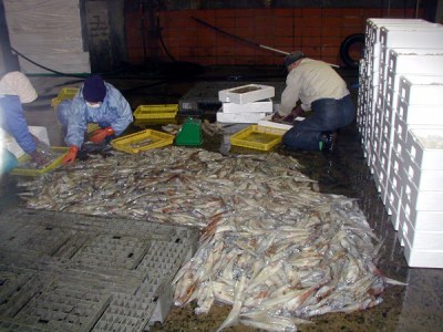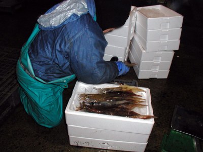 出荷2:漁獲されたヤリイカは決められたサイズに仕分けします。