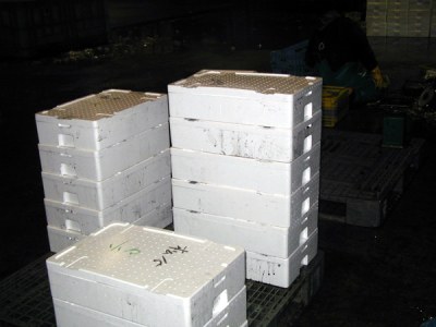 出荷3:下に氷を敷いた発泡に大きさ別に収容します。