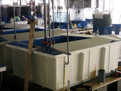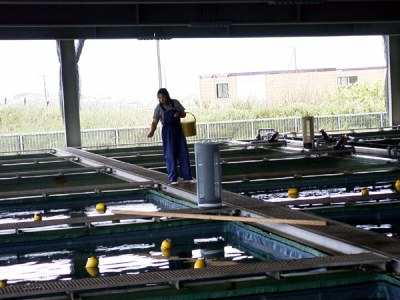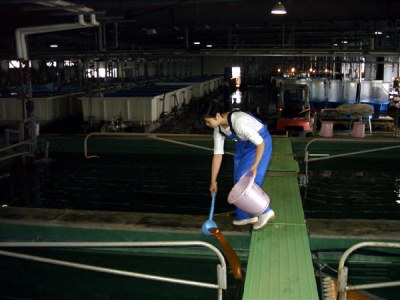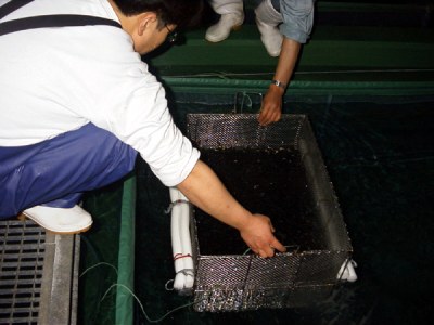 親魚は体重1キログラム前後の天然魚を使用し、雄と雌の尾数を2:1の割合で、親魚水槽(50tコンクリート水槽;10.0×5.0×1.0メートル)に収容し、飼育します。