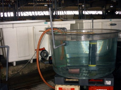 出産された仔魚が雌の親の胸びれで煽られて自力で泳ぎだしたら、オーバーフロー方式で1tパンライト水槽に回収し、計数します。計数された仔魚は、仔魚水槽に収容します。