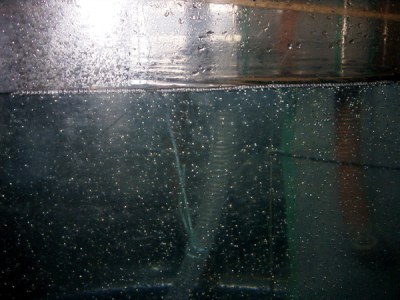 中間育成先では、太いホースをサイフォンにして水槽から生け簀に移します。