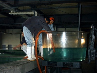 産み出された仔魚を仔魚水槽に収容します。