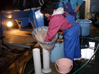 受精から出産までは平均水温10.4℃で46日であり、腹の張った雌をタモ網ですくい、受精卵の発生段階を観察し、卵発生のステージごとに分けて出産用水槽に収容します。