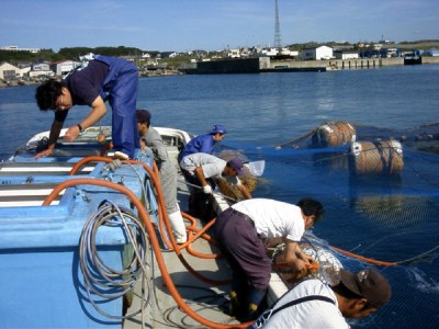産まれた仔魚には、ワムシ、アルテミア、配合飼料の順に組み合わせて給餌し、2ヶ月ほど飼育して全長30ミリメートル前後で種苗として配布します。供給された種苗は、漁港内の浮き生け簀や陸上水槽で、主に配合飼料を与えられて飼育され、その年の秋に全長100mm前後で放流されます。