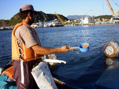 漁業者による給餌の様子です。