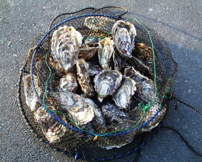 稚貝を水槽からタマネギ袋に移し替えて出荷の準備です。