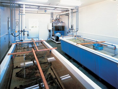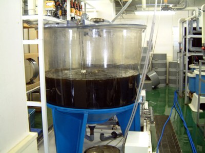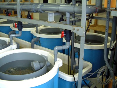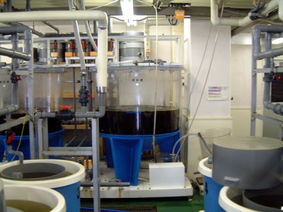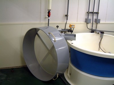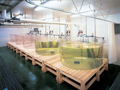 厚岸町カキ種苗センターでの中間育成は、最新の育成システムで自動的に飼育を行っています。システムの概要は、中央の角形水槽を挟み、片面13基、計26基の円形の循環水槽(全体で6トン)からなり、この円形水槽で育成します。