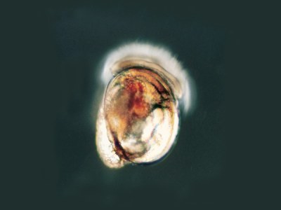 媒精は2月上旬に行い、この後、水温25~28℃で14~16日間、幼生の飼育を行います。幼生の大きさは、受精直後で0.05~0.06ミリメートル、稚貝に変態した時には0.3~0.35ミリメートルです。